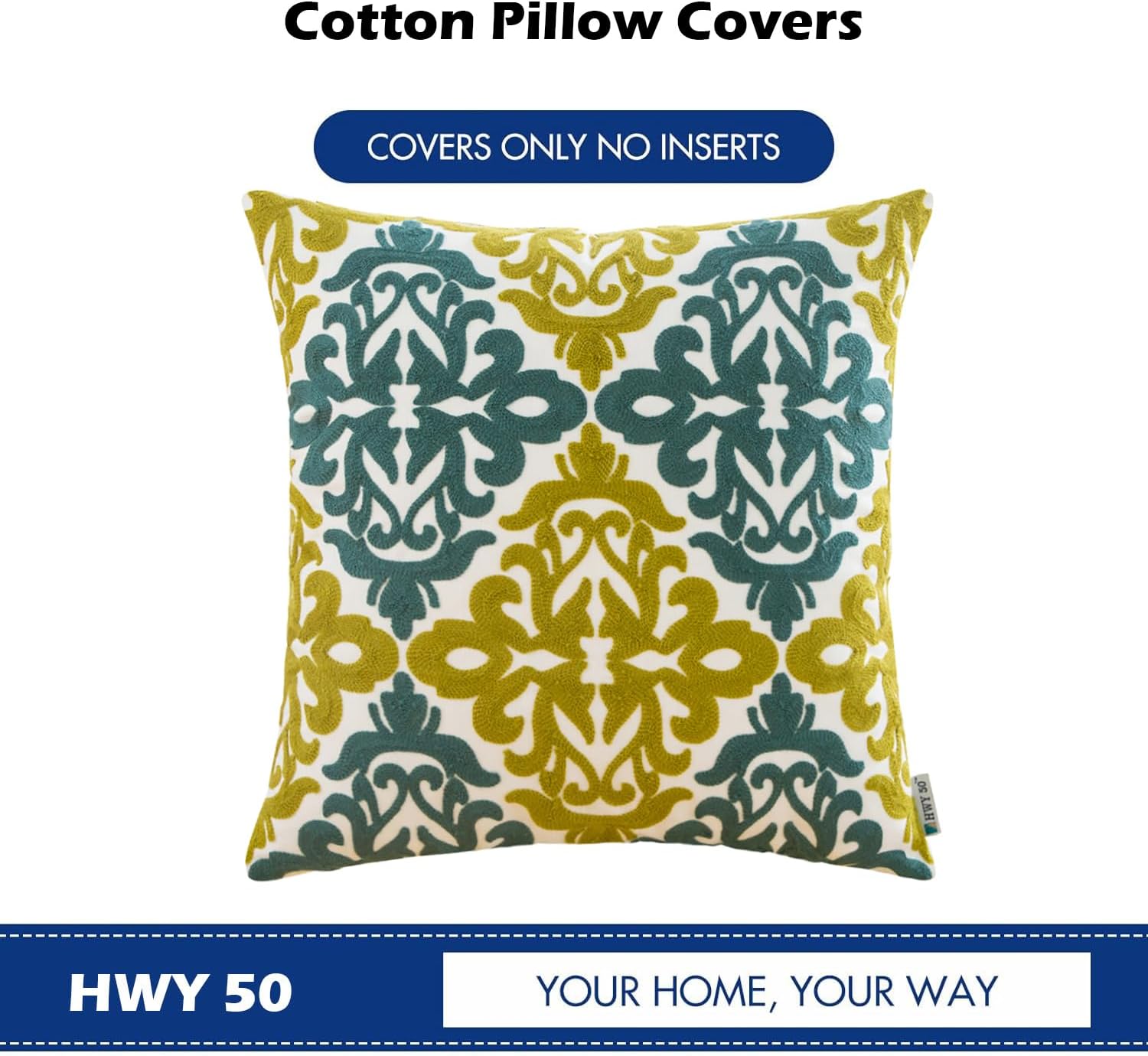HWY 50 Decorative Throw Pillow Covers 18x18 Inch (1 Piece), Embroidered Cotton Farmhouse Cushion Cover Pillow Case for Sofa Couch Living Room Bed Bedroon, Blue and Green Floral Geometric