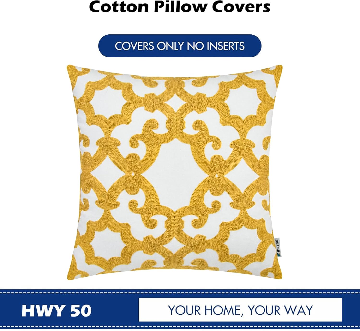 HWY 50 Mustard Yellow Decorative Throw Pillow Covers 18x18 Inch (1 Piece), Embroidered Cotton Farmhouse Cushion Cover Pillow Case for Sofa Couch Living Room Bed, Geometric