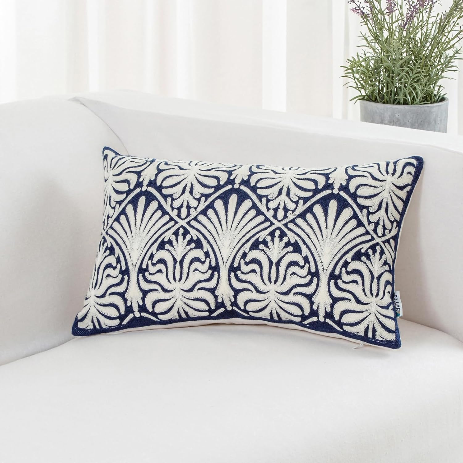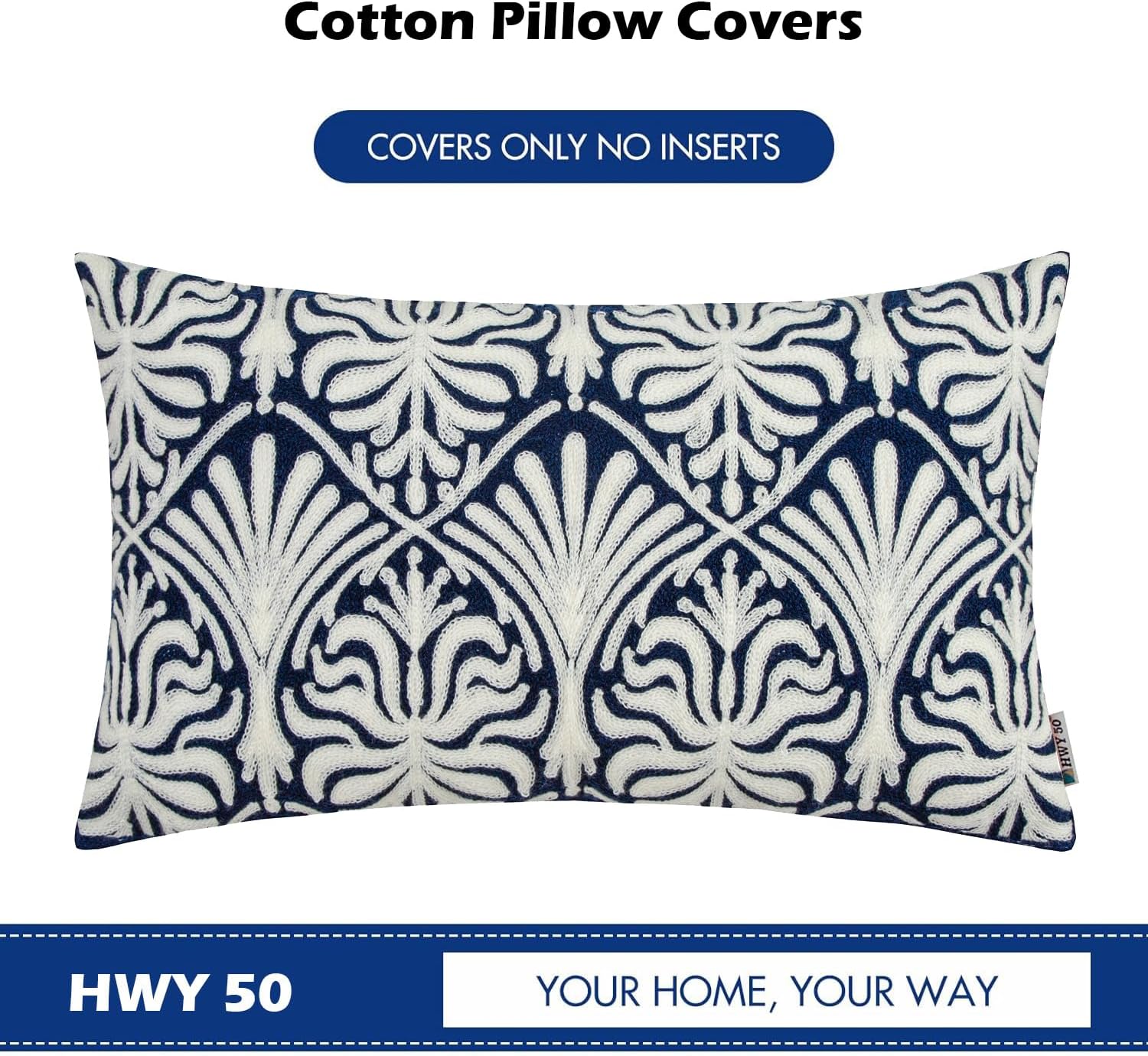 HWY 50 Navy Blue Decorative Lumbar Pillow Cover Rectangle 12x20 Inch (1 Piece), Embroidered Cotton Farmhouse Cushion Cover Pillow Case for Sofa Couch Living Room Bed, Minimalist Floral