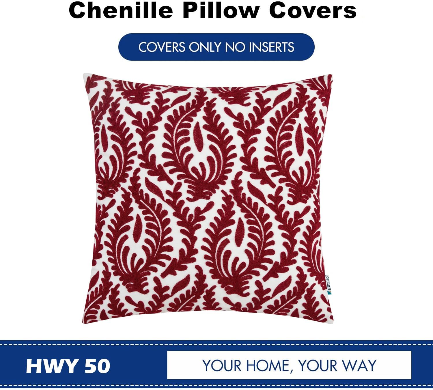 HWY 50 Burgundy Red Decorative Throw Pillow Covers 18x18 Inch (1 Piece), Embroidered Cotton Farmhouse Cushion Cover Pillow Case for Sofa Couch Living Room Bed Bedroon, Floral Branches