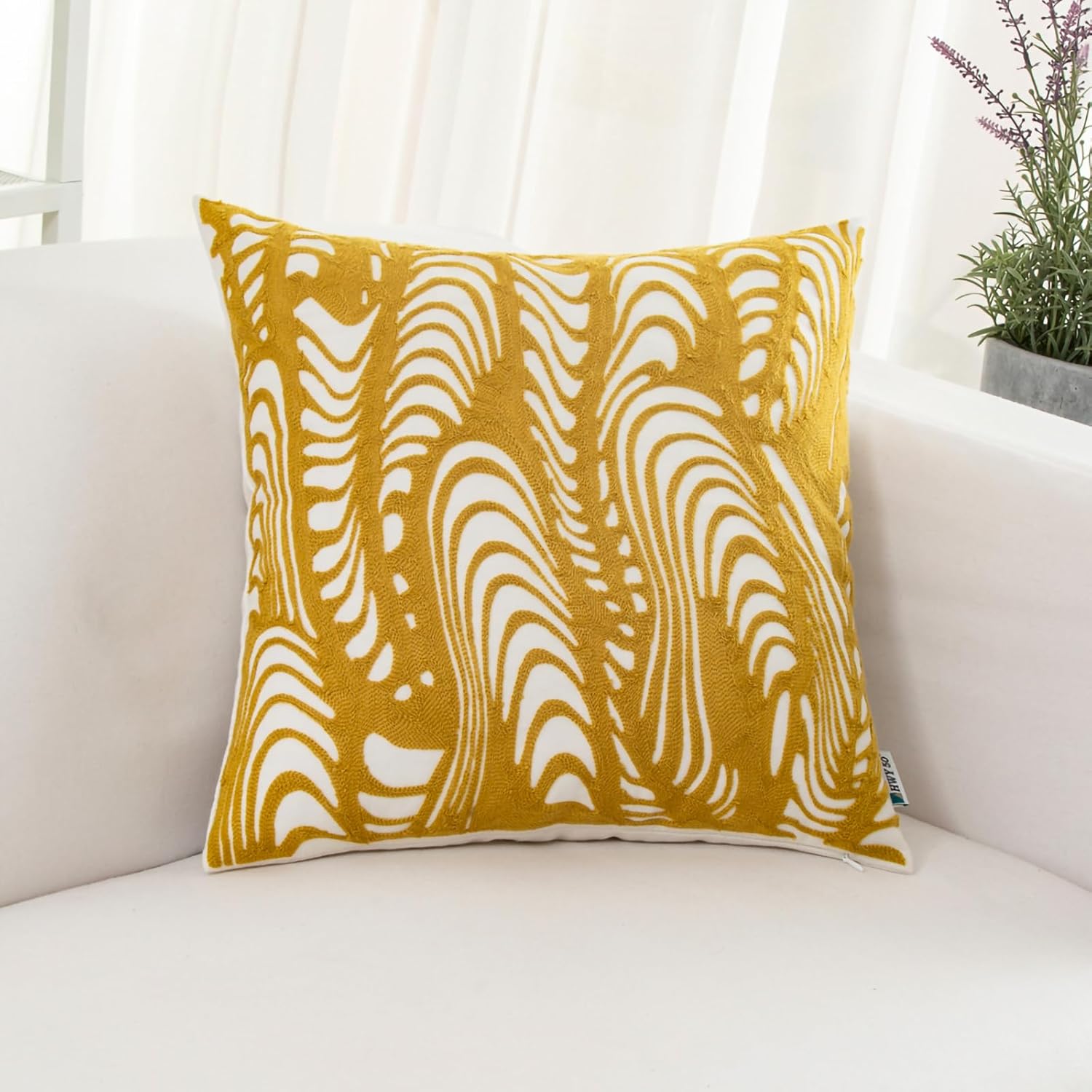 HWY 50 Yellow Decorative Throw Pillow Covers 18x18 Inch (1 Piece), Embroidered Cotton Farmhouse Cushion Cover Pillow Case for Sofa Couch Living Room Bed, Texture
