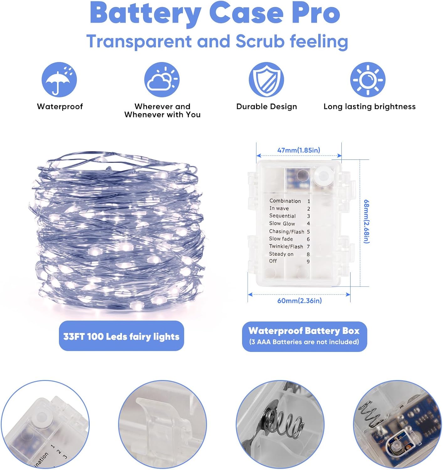 - Weatherproof Design: IP44 rated waterproof battery box and rubber-sealed string lights endure any weather, making them perfect for outdoor decoration.