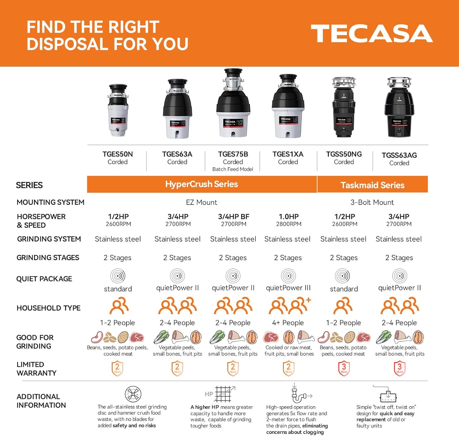 1/2 HP Garbage Disposal, TECASA Food Garbage Disposal with Power Cord, Stainless Steel Grinding System and 3-Bolt Mounting, Continuous Feed Compact Garbage Disposals, UL Certified, Taskmaid Series 50