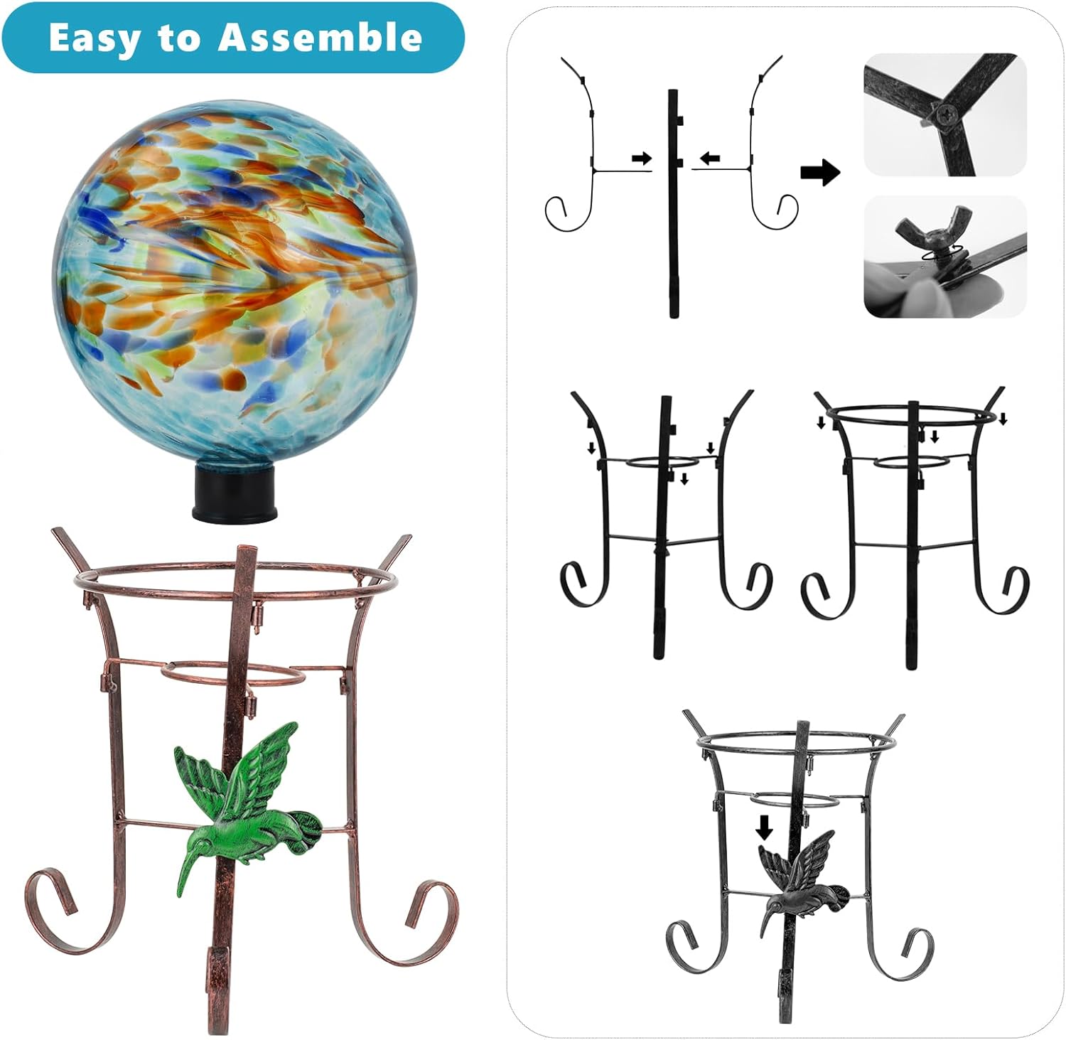 - Exquisite Design: The glass gaze globe designed with swirls of color for an unique artisanal look and copper gazing globe stand with a green hummingbird decor, this exquisite gazing ball with holder set will catch the eyes of garden lovers and interior decorators alike, adding a different kind of surprise while providing your home with a gorgeous decoration