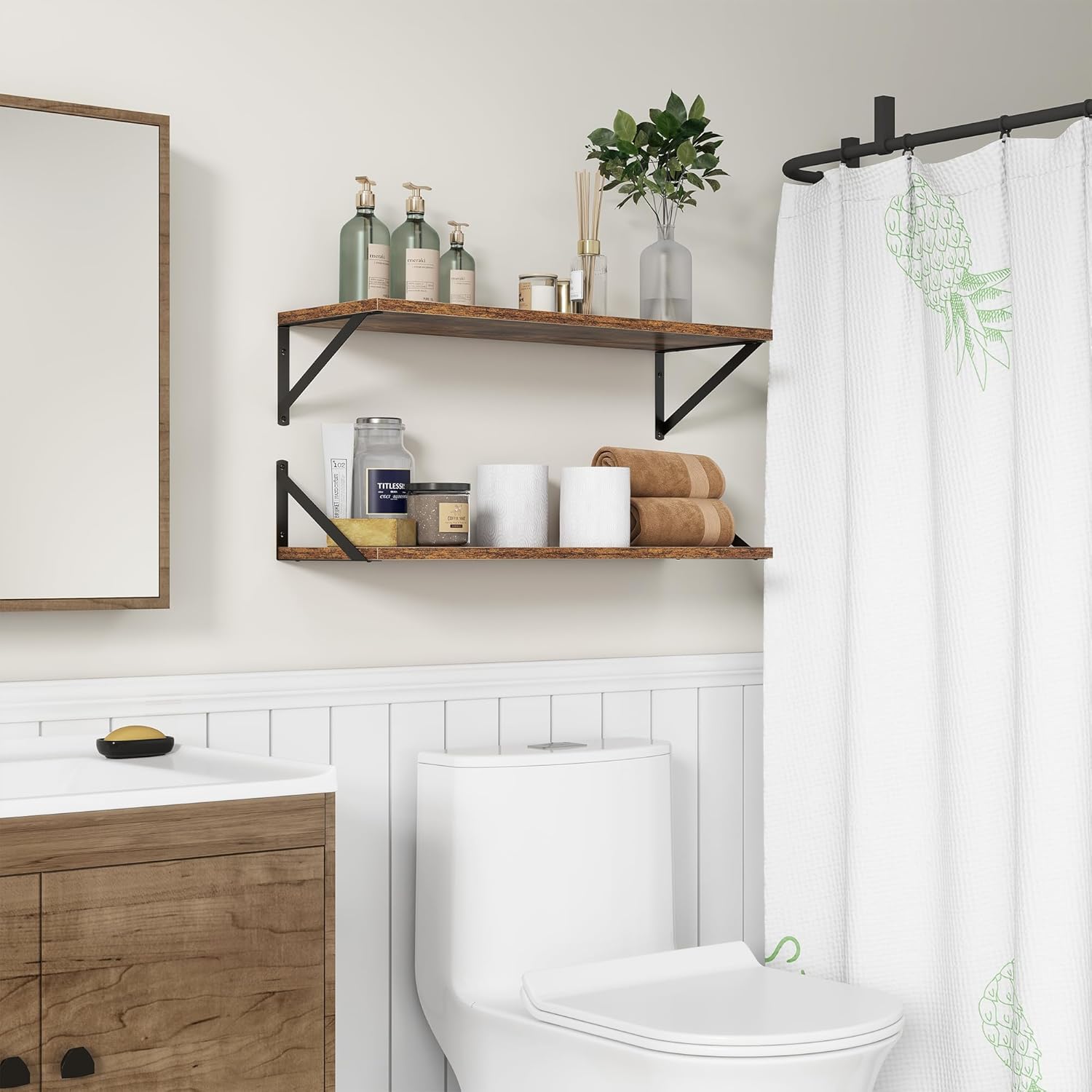 - 【DECORATIVE & FUNCTIONAL】The wall-mounted floating shelves are designed for decoration and storage, utilizing and decorating any space in your home. Used as shelf decor to show your collection, books, or prize, the hanging shelves are perfect for displaying your photo frame, small plants, model, or audio in your living room, office, study. And can also use as over the toilet storage shelf in the bathroom to hold toiletries or used as kitchen shelf to storage condiments.